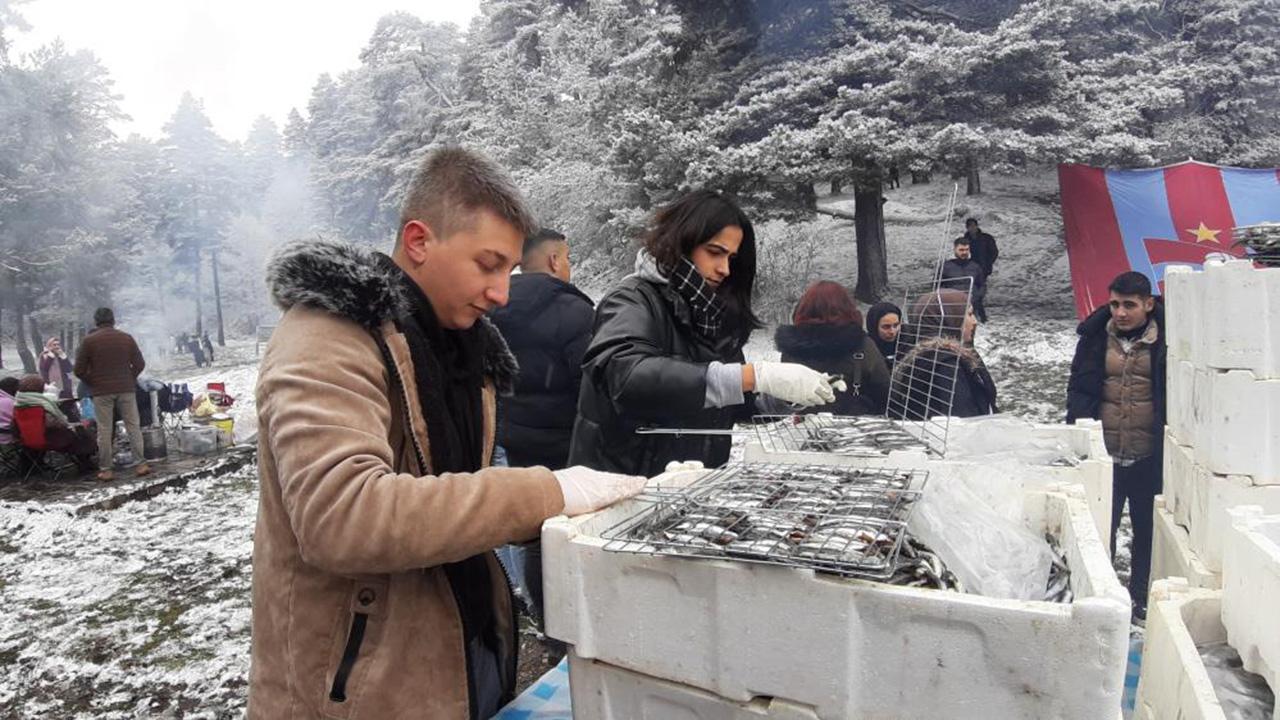 Milli parkta Üniversiteli Trabzonsporlular Topluluğu'nca düzenlenen 13. Geleneksel Abant Hamsi Festivali de kar manzaraları eşliğinde yoğun katılımla yapıldı.