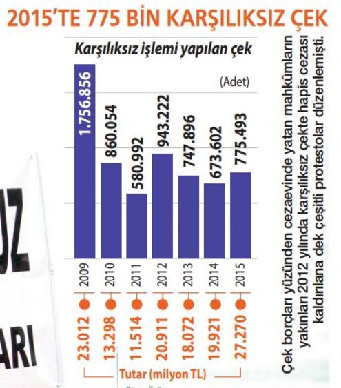 2013’te 18.1 milyar liraya gerileyen karşılıksız çek tutarı 2014’te 19.9 milyar, 2015 sonunda ise 27.3 milyar liraya fırladı. Taslak düzenleme aynen kabul edilirse karşılıksız çekte 2012’de kaldırılan hapis cezası geri getirilecek. Ceza miktarı istişareler sonucunda belirlenecek ve Bakanlar Kurulu’na sunulacak