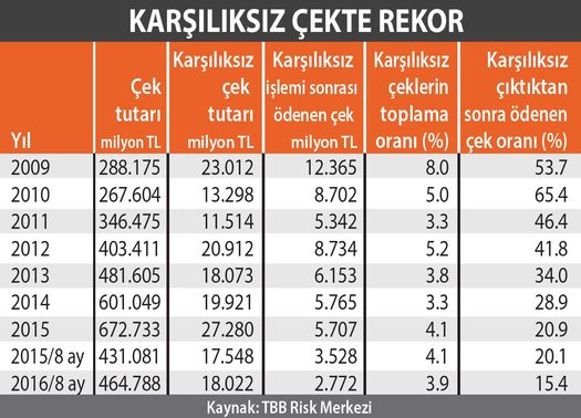 - Çek kullanımı artarken, karşılıksız işlemi yapıldıktan sonra ödenen çek tutarı kriz sonrasının en düşük düzeyine, yüzde 15’e indi. Bu oran 2009’da yüzde 50’nin üzerindeyken, 2015’in 8 ayında yüzde 20.1’e indi. Gerileme bu yıl daha da şiddetlendi ve yüzde 21.4 azalmayla 2.7 milyar liraya indi.