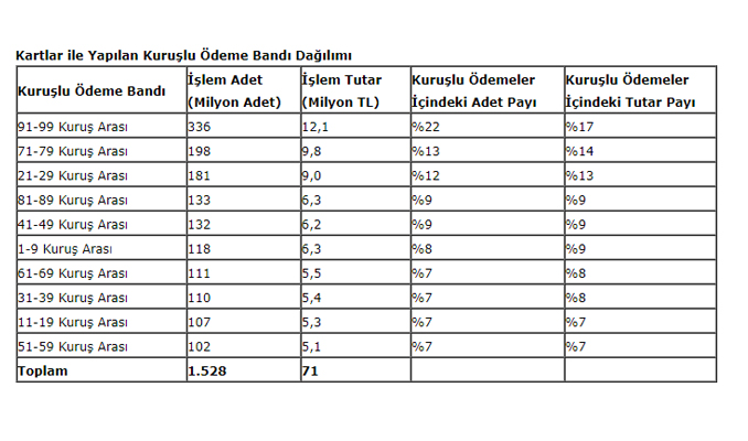 Bankalararası Kart Merkezi'nin (BKM) açıkladığı veriler kartlarla yapılan ödemeler sayesinde para üstü sıkıntısı yaşamadan kuruşlardan ne kadar kar ettiğimizi ortaya koyuyor. Yerli kartlarla Temmuz 2016 – Haziran 2017 dönemini içeren son 1 yılda yurtiçinde yaklaşık 4,36 milyar adet kartlı ödeme işlemi gerçekleşirken, bu işlemlerin yüzde 35'inde yani 1,53 milyar adedinde ödeme tutarının kuruş bareminin 10 kuruş altında gerçekleşmesi dikkat çekiyor. Kuruşlu ödemelerde en fazla işlem adedinin 336 milyon adet işlem ve yüzde 22 pay ile 91-99 kuruş aralığında olduğu görülüyor. 198 milyon adet işlem ve yüzde 13 pay ile 71-79 arası aralığı kuruşlu ödemeler ikinci sırada yer alırken, 181 milyon adet işlem ve yüzde 12 pay ile 21-29 arası kuruşlu ödemeler ise en fazla kuruşlu ödemenin yapıldığı üçüncü aralık olarak ön plana çıkıyor.
