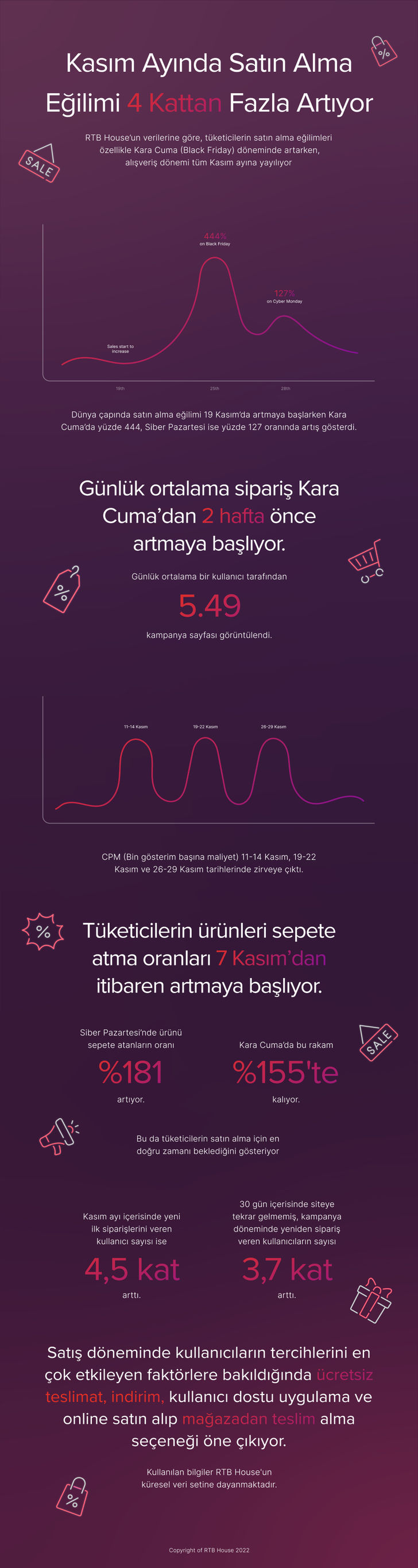 "Google verilerine göre, tüketicilerin yüzde 50’si stoklar tükenmeden indirimli ürünlere ulaşmak için kasım ayı başında alışverişlerine başlıyor. 2021 verilerine göre RTB House müşterilerinin yüzde 70’i de kampanyalarına en az 1 hafta önceden başlıyorlar. Bu sayede erken fırsatlar ile daha fazla satış imkanı ve tüketicinin tüm indirim dönemi boyunca marka ile iletişimde kalması sağlanıyor."