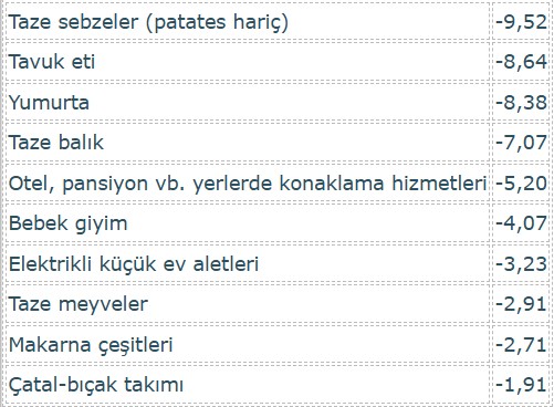 Geçen ay en fazla fiyat düşüşü, yüzde 9,52 ile taze sebzelerde (patates hariç) gerçekleşti. Bunu yüzde 8,64 ile tavuk eti, yüzde 8,38 ile yumurta, yüzde 7,07 ile taze balık, yüzde 5,2 ile otel, pansiyon gibi yerlerde konaklama hizmetleri takip etti.