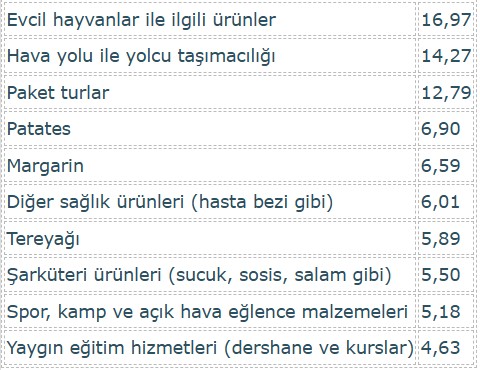 Kasımda fiyatı en çok artış gösteren diğer ürünler arasında, yüzde 6,9 ile patates, yüzde 6,59 ile margarin, yüzde 6,01 ile diğer sağlık ürünleri (hasta bezi gibi) ve yüzde 5,89 ile tereyağı yer aldı.