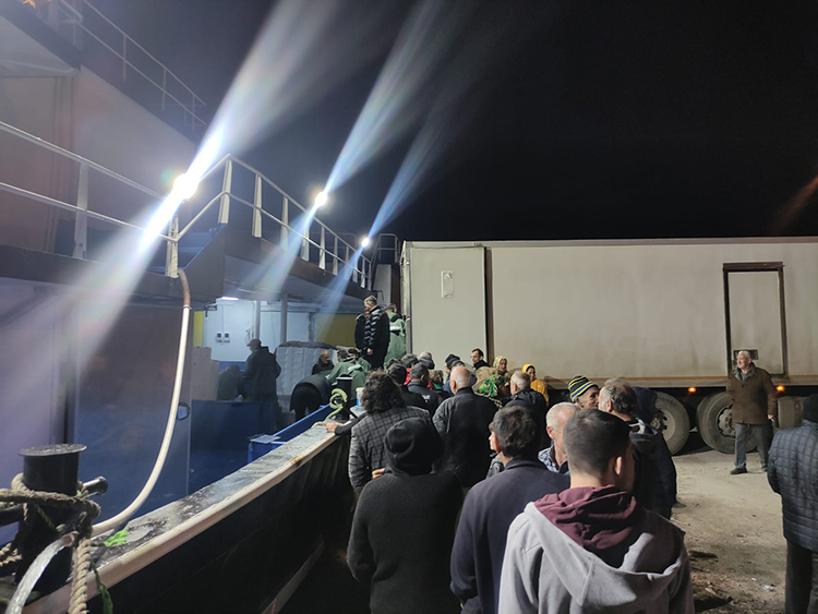 Karadeniz'e açılarak avlanan balıkçıların limana dönmelerinin ardından hamsiler önce kasalara alındı, sonra buzlanarak tırlara yüklendi.