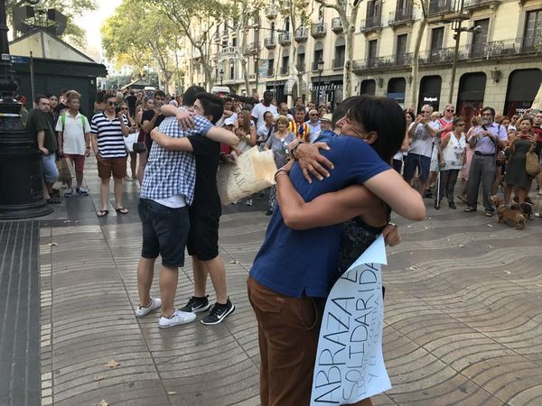 La Rambla'nın bir diğer köşesinde ise Kanarya Adaları asıllı iki genç "kucaklaşma" eylemi yaptı.