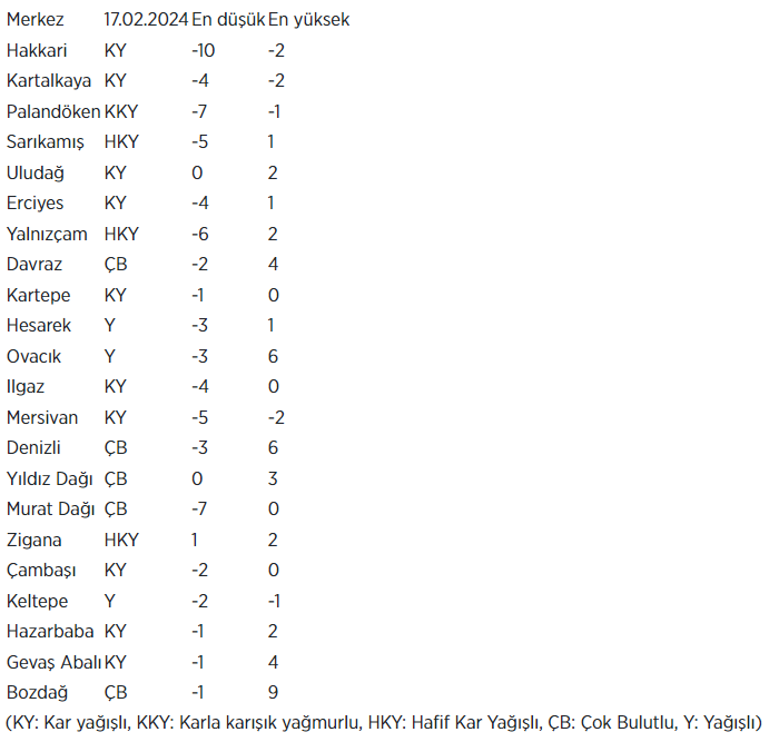 Meteoroloji Genel Müdürlüğü verilerinden derlenen bilgilere göre, kayak merkezlerindeki kar kalınlığı Hakkari'de 174, Kartalkaya'da 169, Palandöken'de 158, Sarıkamış'ta 155, Uludağ ve Erciyes'te 65, Yalnızçam'da 64, Davraz'da 59, Kartepe'de 50, Hesarek ve Ovacık'ta 40, Ilgaz'da 28, Mersivan ve Denizli'de 26, Yıldız Dağı, Murat Dağı ve Zigana'da 25, Çambaşı'nda 20, Keltepe'de 12, Hazarbaba'da 5, Gevaş Abalı'da 4 ve Bozdağ'da 2 santimetre ölçüldü.