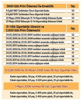 Yaştan emeklilik için her koşulda 10 yıl çalışmış olmak yetmez. 9 Eylül 1999 ila 30 Nisan 2008 arasında ilk kez sigortalı olanlar 4.500 günle, 1 Mayıs 2008 sonrası ilk kez sigortalı olanlar ise 5.400 prim günüyle yaştan emekli olabilirler.