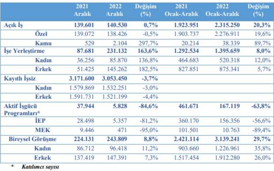 İŞKUR aracılığıyla aralık ayında 145 bin 262’si (%62,8) erkek, 85 bin 870’i (%37,2) kadın olmak üzere 231 bin 132 işe yerleşme gerçekleşti. 2022 yılında ise 1 milyon 395 bin 659 işe yerleştirmeye aracılık edildi.