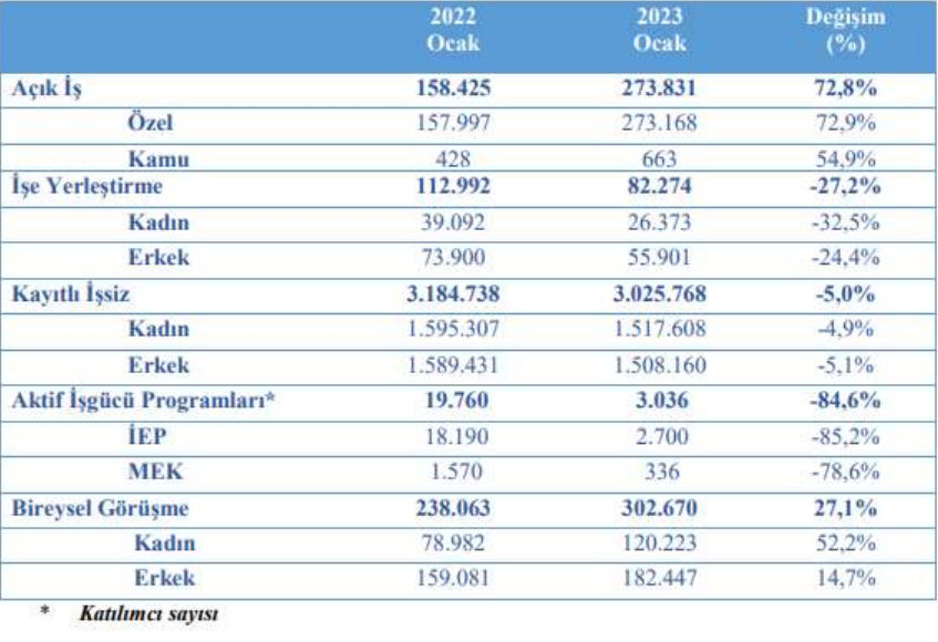 ocak 2023 döneminde sektörler itibarıyla en fazla işe yerleştirme sanayi sektöründe “İmalat” alanında; mesleklere göre ise en fazla işe yerleştirme sırasıyla “Özel Güvenlik Görevlisi (Silahsız), Konfeksiyon İşçisi ve Garson (Servis Elemanı)” mesleklerinde gerçekleştirildi.