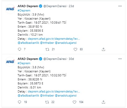 Afet ve Acil Durum Yönetimi Başkanlığının (AFAD) sitesinde yer alan bilgiye göre, Kayseri'nin Kocasinan ilçesinde 3,9 büyüklüğünde deprem yaşandı.