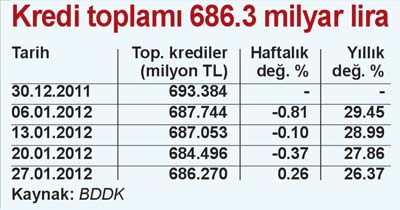 BDDK verilerine göre, sektörde krediler toplamı (mali kesime verilenler dahil) 27 Ocak itibariyle geçen yılın aynı dönemine göre yüzde 26.4 artışla 686 milyar 270 milyon TL’ye çıktı.