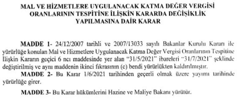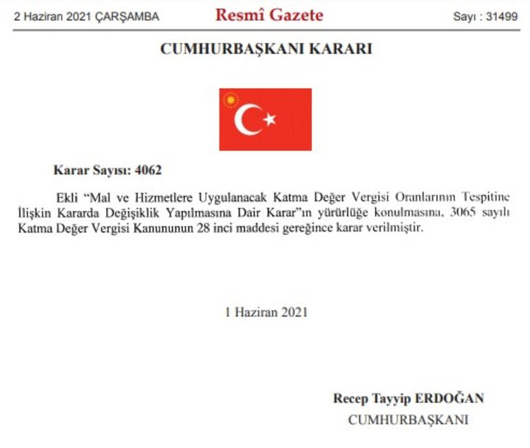Cumhurbaşkanı Recep Tayyip Erdoğan'ın imzasıyla Resmi Gazete'de yayımlanan karara göre Katma Değer Vergisi ve kira stopaj oranlarındaki indirim uygulamasının 2 ay daha uzatılmasına karar verildi.