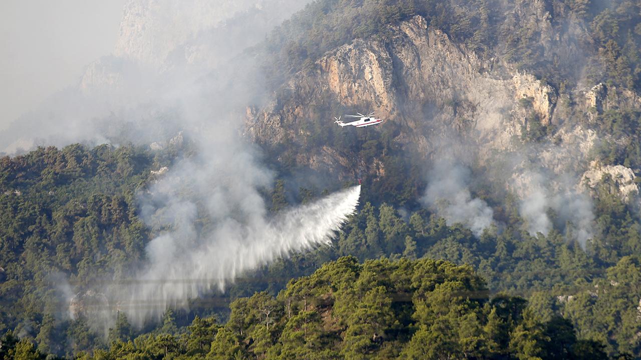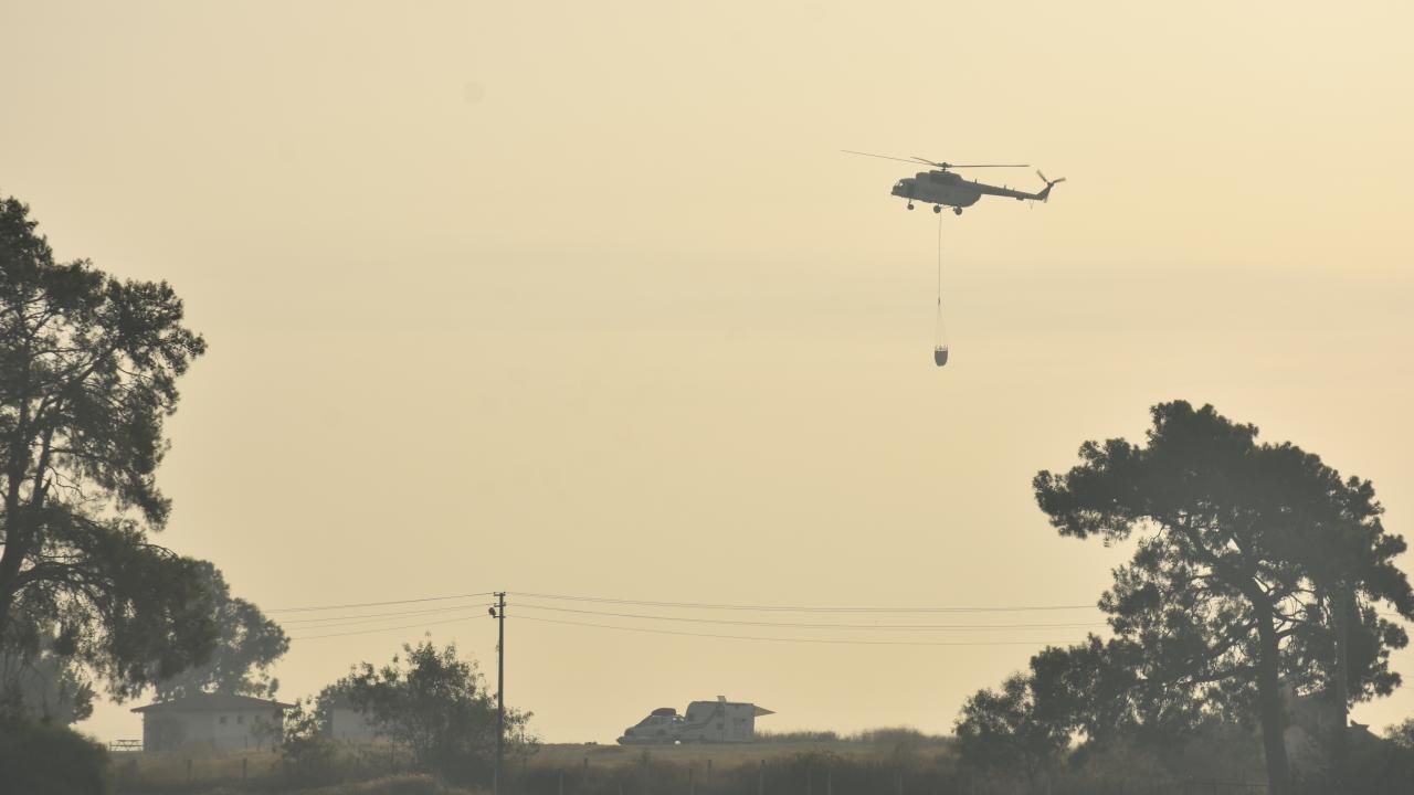 Bölgede görev yapan helikopterler, denizden aldıkları suyu yanan alanlara taşıyarak söndürme çalışmalarına destek veriyor.