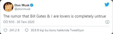 64 yaşındaki Microsoft kurucusundan hazzetmediğini ima eden tweetler atan 49 yaşındaki mucit-girişimci, "Bill Gates'le benim sevgili olduğum dedikodusu tümüyle gerçekdışı", "Billy G benim sevgilim değil" dedi.