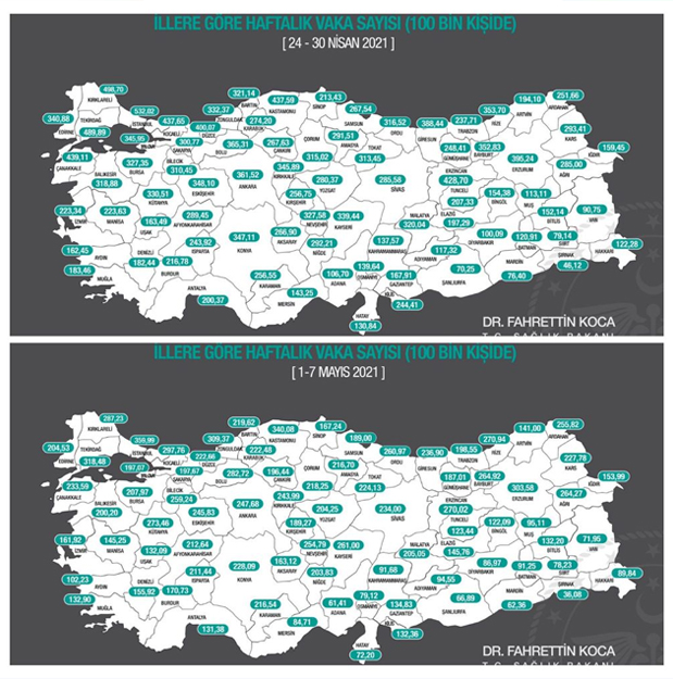 Sağlık Bakanlığı’nın açıkladığı risk haritasında 24-30 Nisan tarihlerinde 100 bin kişide 437,65 olan vaka sayısı, 1- 7 Mayıs tarihlerinde 297,76’ya geriledi.