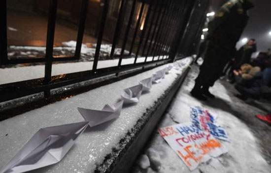 Ukrayna 112 televizyon kanalının haberine göre, protestocular Kiev'deki Rusya Büyükelçiliğine havai fişekle saldırdı, büyükelçilik önünde lastik yaktı.