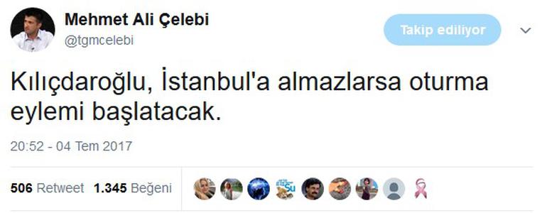 CHP Genel Başkanı Kemal Kılıçdaroğlu’nun, CHP’li vekil Enis Berberoğlu’nun tutuklanması sonrasında başlattığı “Adalet Yürüyüşü” 21. gününe girdi. Kemal Kılıçdaroğlu, Kocaeli'de parti MYK'sını topladı. CHP PM üyesi Mehmet Ali Çelebi de sosyal medya hesabından dikkat çeken bir mesaj yazdı. Çelebi, "Kılıçdaroğlu, İstanbul'a almazlarsa oturma eylemi başlatacak" diye yazdı.