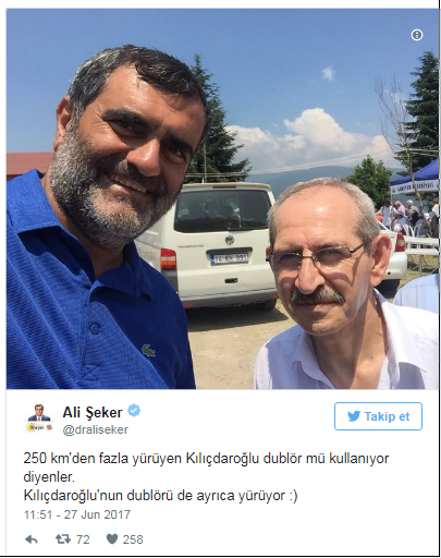 CHP Genel Başkanı Kemal Kılıçdaroğlu, partisinin İstanbul Milletvekili Enis Berberoğlu'nun tutuklanmasına tepki olarak 13 gündür yürüyor. Bu yürüyüşte kendisine milletvekilleri de eşlik ediyor. Kılıçdaroğlu'nun yanında yürüyenlerden biri de CHP İstanbul milletvekili doktor Ali Şeker. Şeker, Twitter hesabından Kılıçdaroğlu ile ilgili esprili bir mesaj paylaştı. CHP'li vekil "250 kilometreden fazla yürüyen Kılıçdaroğlu dublör mü kullanıyor diyenler. Kılıçdaroğlu'nun dublörü de ayrıca yürüyor :)" dedi.
