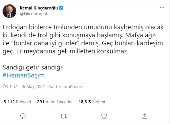 Kılıçdaroğlu, kişisel Twitter hesabında yaptığı paylaşımda "Erdoğan binlerce trolünden umudunu kaybetmiş olacak ki, kendi de trol gibi konuşmaya başlamış. Mafya ağzı ile 'Bunlar daha iyi günler' demiş. Geç bunları kardeşim geç. Er meydanına gel, milletten korkulmaz. Sandığı getir sandığı" ifadesini kullandı.