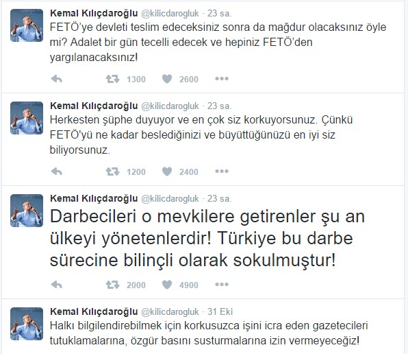 CHP Genel Başkanı Kemal Kılıçdaroğlu, Twitter hesabından FETÖ ile mücadeleye ilişkin iktidara yüklendi. Kılıçdaroğlu, şunları yazdı: