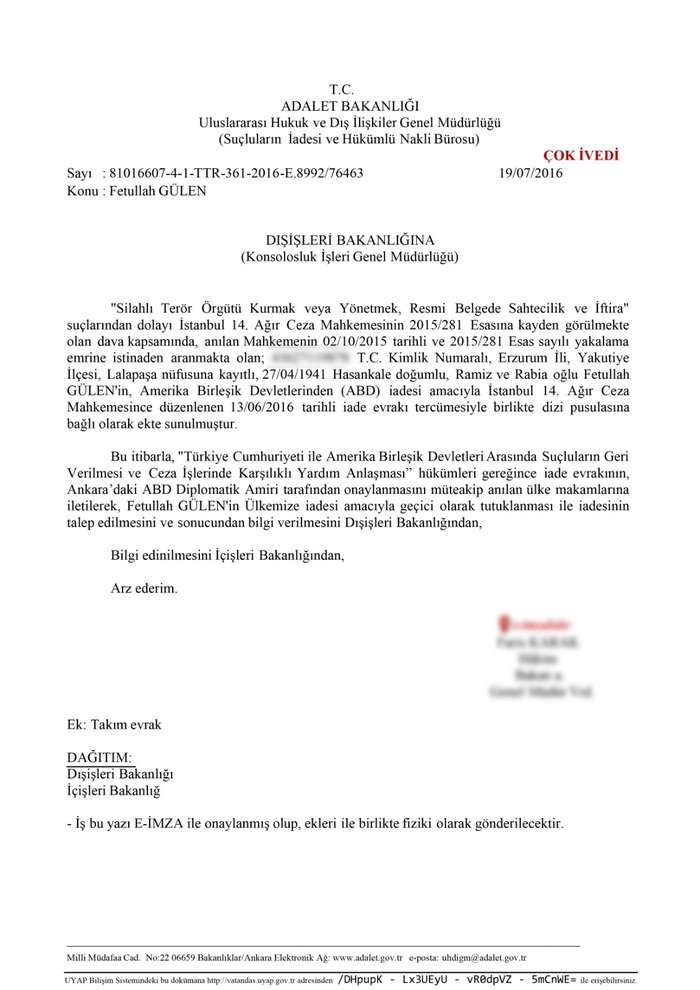 "Adalet Bakanlığı tarafından FETÖ elebaşı hakkında 15 Temmuz 2016'daki hain darbe teşebbüsünün hemen ardından 19 Temmuz 2016 tarihinde ilk iade talepnamesi gönderilmiş,19 Temmuz 2017 ve 3 Kasım 2017 tarihlerinde olmak üzere toplam 7 ayrı iade talepnamesi ABD makamlarına gönderilmiştir.