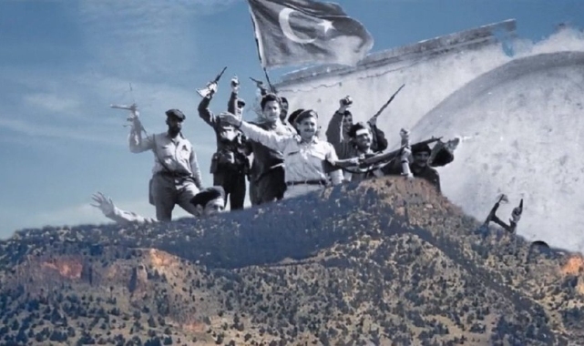 Videoda Kıbrıs’taki Türk mücahitler diye EOKA terör örgütü mensuplarının yer aldığı bir fotoğraf kullanıldı. Söz konusu fotoğrafta, 23 Nisan 1964’te EOKA’lı teröristlerin ele geçirdiği Türk bayrağı görülüyor.