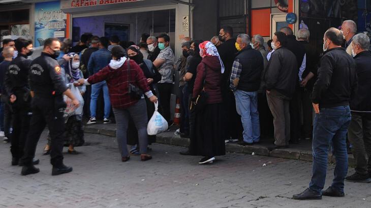 Uzun kuyruk oluşan tezgah önünde polis, zaman zaman vatandaşları Kovid-19 tedbirleri kapsamında maske takmaları ve sosyal mesafeye dikkat etmeleri için uyardı.