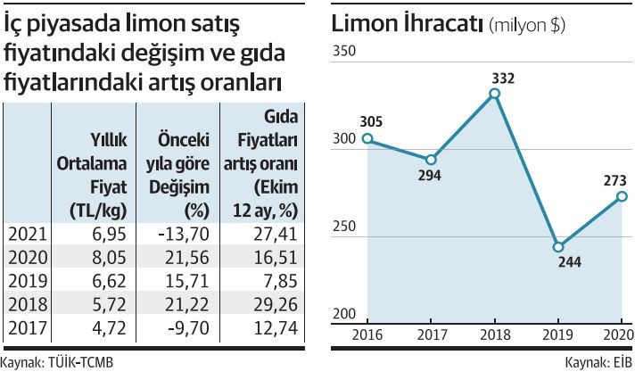 Tüm dünya ile birlikte Türkiye’de de genel enflasyon oranını yukarı itecek ölçüde gıda ürünlerinde yüksek oranlı artışlar yaşanırken, limon piyasasında tersine bir seyir gerçekleşiyor. Son bir yılda limon satış fiyatı yüzde 13,7 düştü. Buna karşılık üretim maliyetinin yüzde 300’e varan oranda arttığı belirtiliyor. Limon fiyatlarındaki düşüşler, üreticiyi, limon ağaçlarını kesmeye ya da satmaya yönlendirdi. Limon üreticileri dikildikten 7 yıl sonra meyve vermeye başlayan limon ağaçlarını keserek emeklerini yok etme noktasına geldiler. Bazı üreticiler ise bahçelerini satışa çıkardı.