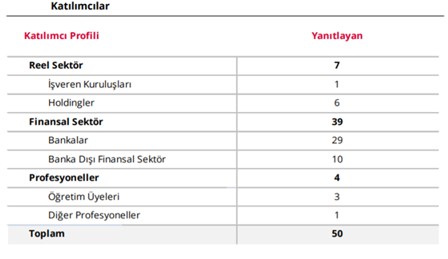 Ankete toplam 50 kişi katılıyor. Bunlardan 39’u banka ve finans profesyoneli, yedisi holding ve işveren profesyoneli, üçü öğretim üyesi ve biri de diğer profesyonel.