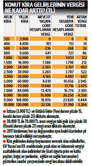 Gelir vergisi oranındaki artıştan (yüzde 27’den, yüzde 30’a) dolayı ise yalnızca kira geliri-matrahı yıllık 30.000 lirayı aşanlar etkilenecek. Yani yıllık kira geliri matrahı 30 bin lirayı geçenler -70 bin liraya kadar gelirleri için- normalde yüzde 27 vergi ödeyeceklerken, tasarı ile ödeyecekleri verginin oranı yüzde 30’a çıkıyor.