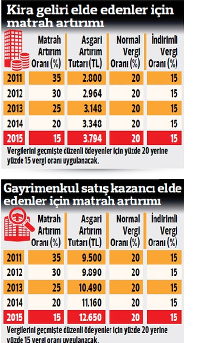 - 2011 için: 560 TL, 2012 için: 593 TL, 2013 için: 630 TL, 2014 için: 670 TL, 2015 için: 759 TL ödendiğinde geçmiş beş yılın vergisi sorulmayacak. Vergi barışından yararlanan mülk sahipleri, kira geliri nedeniyle bir vergi incelemesi yaşamayacak. (İlgili yıllarda kira gelirinden dolayı beyanname verme sınırını –istisna- aşmayanlar için zaten vergi riski yok. Örneğin 2015 için ‘Yıllık 3.600 TL’yi aşmayan konut kira geliri elde edenlerin’ beyanname verme zorunlulukları yoktu. 2015 için İşyeri kiralarında ise yıllık brüt 29.000 TL’yi aşmayan kira geliri için beyanname verme zorunluluğu yoktu.)