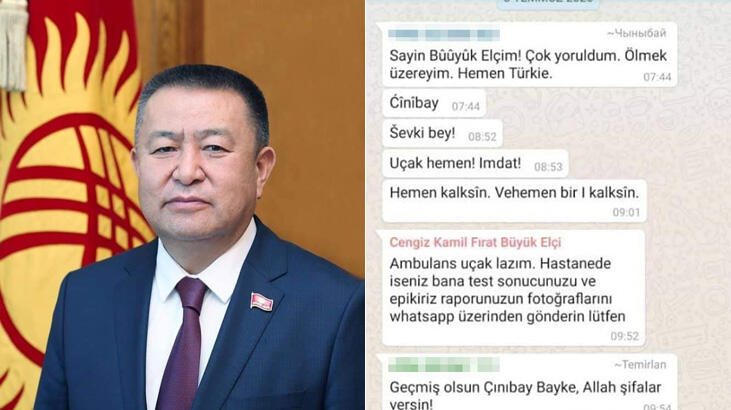 Tursunbekov dostluk grubunda Türkiye Cumhuriyeti Bişkek Büyükelçisi Cengiz Kamil Fırat'a seslenerek, "Sayın Büyükelçi, Çok yoruldum. Ölmek üzereyim. Hemen Türkiye. Uçak hemen. İmdat. Hemen kalksın" mesajı attı. Büyükelçi Fırat da cevaben, "Ambulans uçak lazım. Hastanedeyseniz, bana test sonucunuzu ve epikiriz raporunuzun fotoğraflarını gönderin lütfen" karşılığını verdi.