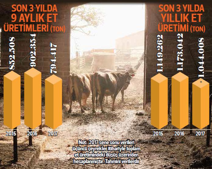 2017’nin ilk aylarında Gıda, Tarım ve Hayvancılık Bakan Yardımcısı Mehmet Daniş, Türkiye’nin 150 bin ton kırmızı et açığı olduğunu söylemişti. 150 bin ton kırmızı eti ithalat yoluyla kapatmak için ödenen ücret ise 1.5 milyar lirayı buluyor. Et üretiminin düşmesiyle birlikte Daniş’in söylemiş olduğu 150 bin tonluk kırmız et açığının ise daha da artacağı tahmin ediliyor.(Burak Coşan/Hürriyet)