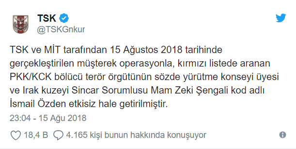Milli Savunma Bakanlığının Twitter hesabından yapılan açıklamada, MİT ile TSK'nın müşterek operasyonuyla İçişleri Bakanlığının Terörden Arananlar Listesi'nde "kırmızı" kategoride bulunan PKK/KCK bölücü terör örgütünün sözde yürütme konseyi üyesi ve Irak kuzeyi Sincar sorumlusu "Mam Zeki Şengali" kod adlı İsmail Özden'in etkisiz hale getirildiği bildirildi.