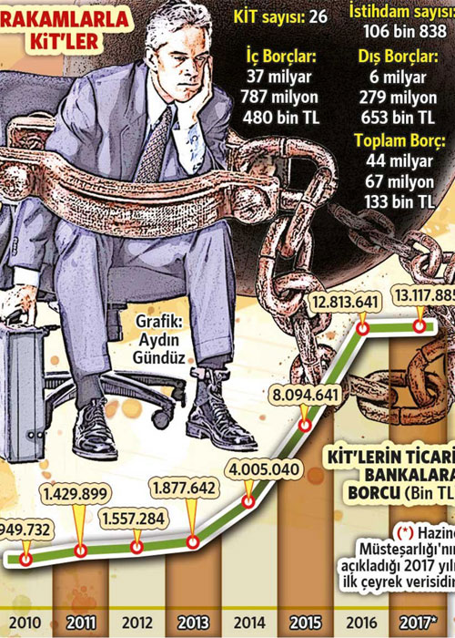 Kuruluşların 2010 yılında ticari bankalara olan borcu 950 milyon lira seviyesindeyken, 2014'de ciddi oranda bir artışla 4 milyar liraya kadar çıktı, 2015'de 8 milyar lira olan ticari bankalar borcu, 2017 Mart ayı itibarıyla 13.1 milyar seviyesine çıkmış durumda. 2010'da KİT'lerin toplam borcu 2017'de yüzde 31 azaldı, ancak ticari bankalara olan borç tam yüzde 1281 oranında arttı. 2010'da 186 bin kişiye istihdam sağlayan 28 KİT vardı.