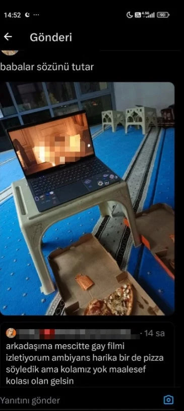 Paylaşımda, “Arkadaşıma mescitte gay filmi izletiyorum, ambiyans harika. Bir de pizza söyledik ama kolamız yok, maalesef. Kolası olan gelsin” ifadeleri yer aldı. Söz konusu paylaşım sosyal medyada hızla yayılırken, olay kamuoyunda infiale yol açtı.