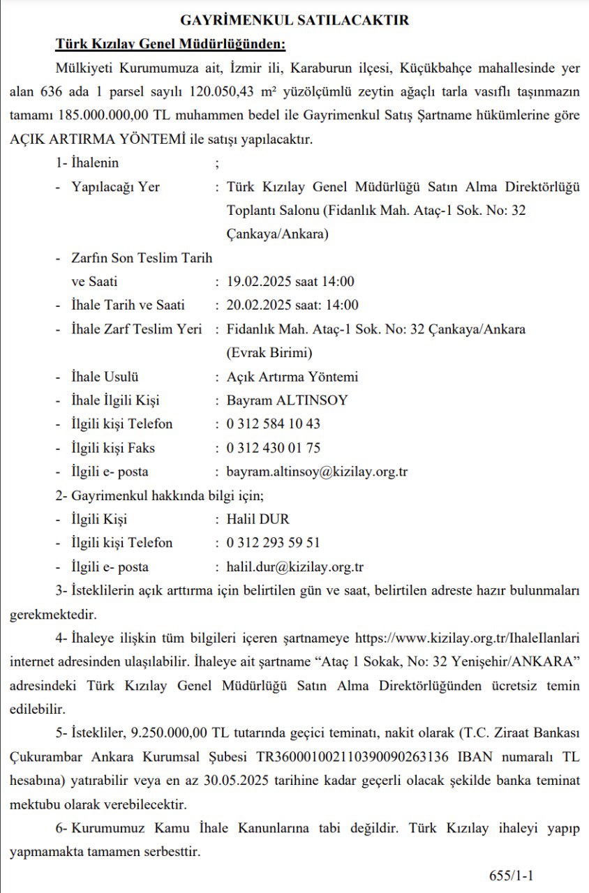 Türkiye’nin en büyük insani yardım kuruluşu Kızılay, İzmir Karaburun’daki 120 bin metrekarelik zeytinliğini satıyor. Resmi Gazete’de yayınlanan ilana göre; mülkiyeti Türk Kızılay’ına ait zeytin ağaçlı tarla vasfındaki taşınmaz Küçükbahçe Mahallesi’nde 636 ada 1 parselde bulunuyor. Denize sıfır konumda olduğu görülen parselin yanında villalar yer alıyor.