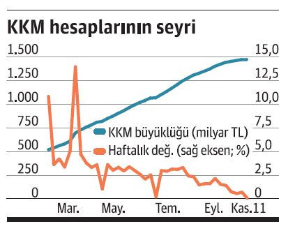 Tüzel kişilerin ilk KKM hesaplarının 6 aylık olması nedeniyle dönüşümlerinin yoğun olduğu temmuz ağustos aylarında da haftalık yüzde 3'ü aşan artışların yaşandığı KKM hesaplarında ekim ayıyla birlikte ise rüzgar tersine dönmeye başladı. Ekimin ilk haftasından itibaren haftalık artışla önce yüzde 1,5'e indi, ekimin son haftasıyla birlikte ise yüzde 1'in de altına geriledi. Kasımın ilk haftasında KKM'de haftalık değişi yüzde 0,72 olurken geçen hafta itibariyle de yüzde 0,06 ile yerinde saydı. Eylül sonunda ulaştığı 1.4 trilyon barajı 1.5 aydır aşılamadı.