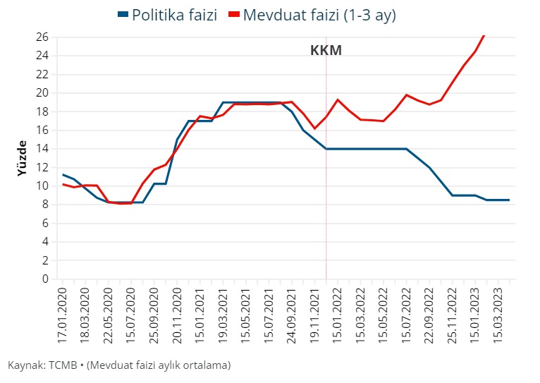 Türkiye Cumhuriyet Merkez Bankası (TCMB) KKM sonrası politika faizini düşürmeye devam etti. KKM sonrası mevduat faizleri de kademeli şekilde yükseldi.