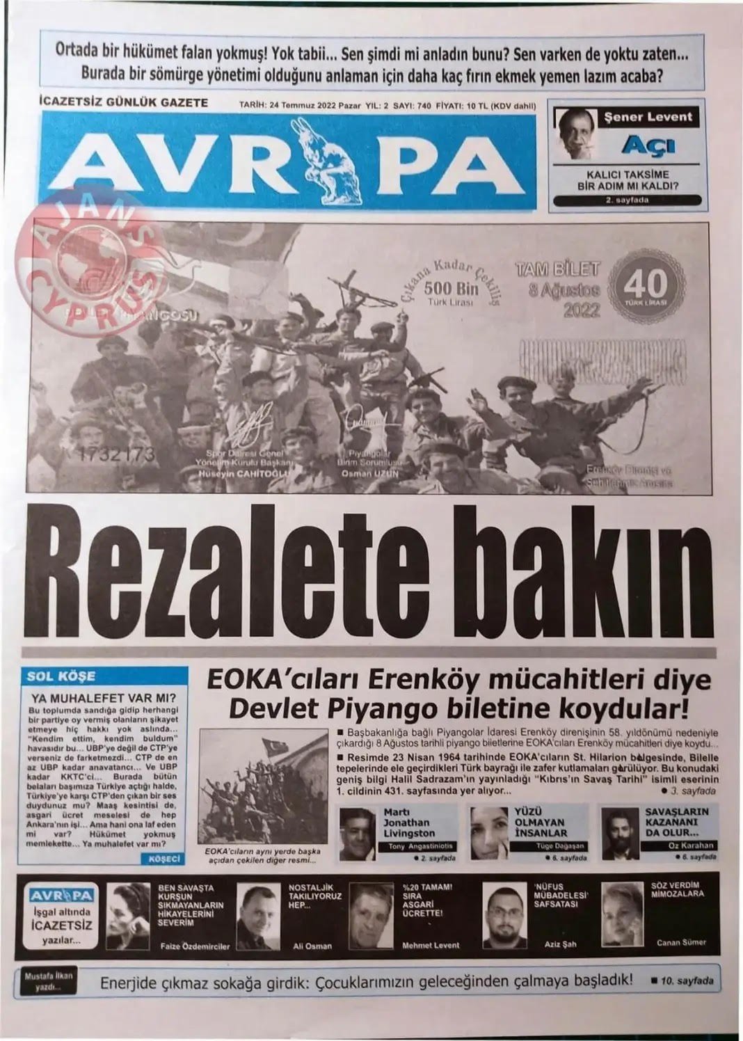KKTC Başbakanlığı’na bağlı Piyangolar İdaresi’nin EOKA’cıların fotoğrafını basmasını Kıbrıs Detay gazetesi manşetlerine taşıdı.