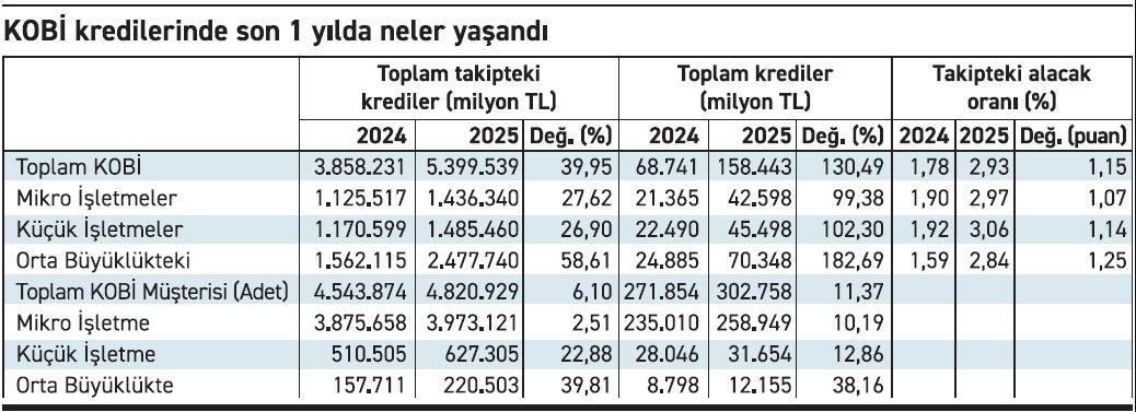 Toplam KOBİ kredilerinde takipteki alacak miktarı artışı yüzde 130,5 olurken bu TL cinsi kredilerde yüzde 131,9, yabancı para cinsi kredilerde ise yüzde 79,93 artış olarak yansıdı. Mikro işletmelerde takipteki alacak miktarında toplam artış yüzde 99,4 ile ikiye katlandı, mikro işletmelerin TL kredilerinde takipteki alacak yüzde 99,4, yabancı para kredilerde ise yüzde 03,16 büyüdü. Küçük işletmelerde de son bir yılda takipteki alacak artışı iki katını aşan bir yükseliş yaşadı. Küçük işletmelerde TL kredilerde takipteki alacak miktarı yüzde 104,6 arttı, yabancı para kredilerde ise yüzde 49,7 artış gerçekleşti. Küçük işletmelerde toplam takipteki alacak büyümesi ise yüzde 102,3 oldu. Orta ölçekli işletmelerde hem TL cinsi hem de yabancı para cinsi kredilerde takipteki alacak miktarı artışı dikkat çekti. Orta büyüklükteki işletmelerde TL cinsi kredilere takipteki alacak artışı yüzde 185,2, yabancı para kredilerde yüzde 112,16 olurken toplamda yüzde 182,7 hesaplandı.