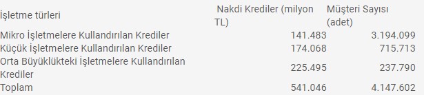 Aynı dönemde küçük işletmelere kullandırılan kredi bakiyesi yüzde 12,2 artışla 174,1 milyar liraya ve mikro işletmelere kullandırılan kredi bakiyesi yüzde 13,5 yükselişle 141,5 milyar liraya ulaştı. KOBİ kredilerinde küçük işletmelerin payı yüzde 32,2, mikro işletmelerin payı yüzde 26,1 olarak oldu.