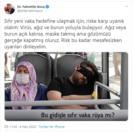 Sağlık Bakanı Dr. Fahrettin Koca'nın, 4 Haziran'da sosyal medya hesabından "Sıfır yeni vaka hedefine ulaşmak için, riske karşı uyanık olalım: Virüs, ağız ve burun yoluyla bulaşıyor.