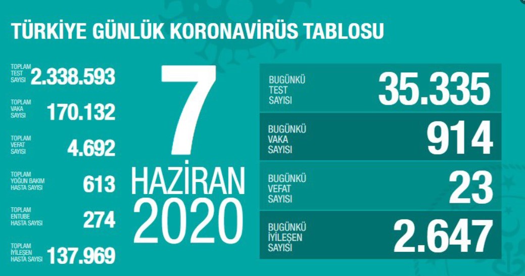 Sağlık Bakanı Fahrettin Koca, bugün yapılan 35 bin 335 korona virüs testinden 914'ünün pozitif çıktığını, 23 hastanın hayatını kaybettiğini, toplam can kaybının 4 bin 692'ye ulaştığını, toplam iyileşen hasta sayısının ise 137 bin 669 olduğunu duyurdu.