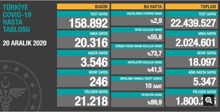 Türkiye'de son 24 saatte 158 bin 892 Kovid-19 testi yapıldı, 20 bin 316 kişinin testi pozitif çıktı, 246 kişi hayatını kaybetti.