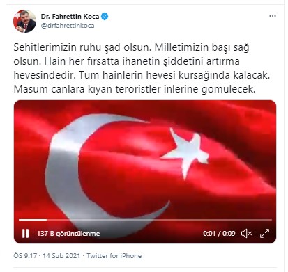 Koca, Twitter hesabından yaptığı paylaşımda, "Şehitlerimizin ruhu şad olsun. Milletimizin başı sağ olsun. Hain her fırsatta ihanetin şiddetini artırma hevesindedir. Tüm hainlerin hevesi kursağında kalacak. Masum canlara kıyan teröristler inlerine gömülecek." ifadelerini kullandı.