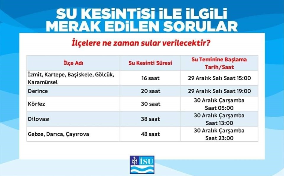 Bugün saat 23.00’ten itibaren Gebze, Darıca ve Çayırova ilçelerine 48 saat boyunca, İzmit, Kartepe, Başiskele, Gölcük ve Karamürsel’de 16 saat, Derince’de 20 saat, Körfez’de 30 saat, Dilovası’nda ise 38 saat su kesintisi yaşanacak.