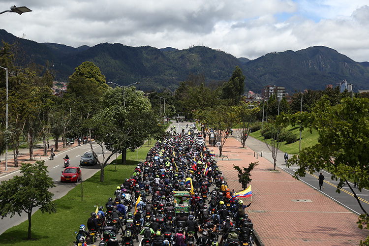 Başkent Bogota'da toplanan 48 motosiklet örgütü, kendilerine yönelik alınan güvenlik önlemlerini protesto etmek için bir araya geldi. Kentin en büyük caddesini trafiğe kapatan göstericiler daha sonra motorlarına binerek yoğun korna sesleri eşliğinde Bogota Belediyesinin aldığı kararları protesto etti.