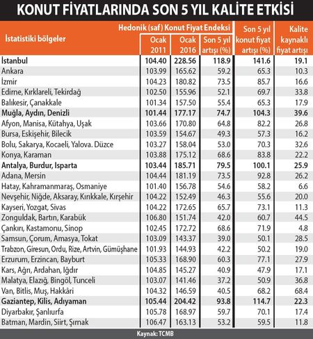- Hedonik Endeks ile Merkez Bankası konut fiyat artışlarına iyi bir ince ayar çekti. Bu hesaba göre Türkiye çapında konut fiyatlarında son 5 yılda yaşanan reel artış yüzde 13.4. Kalite artışını dikkate almayan nihai ve gerçekleşen fiyatlar ise yüzde 31.7’lik artış kaydetti. Yani toplam artışın yaklaşık yarısı kalite artışından kaynaklanmış.