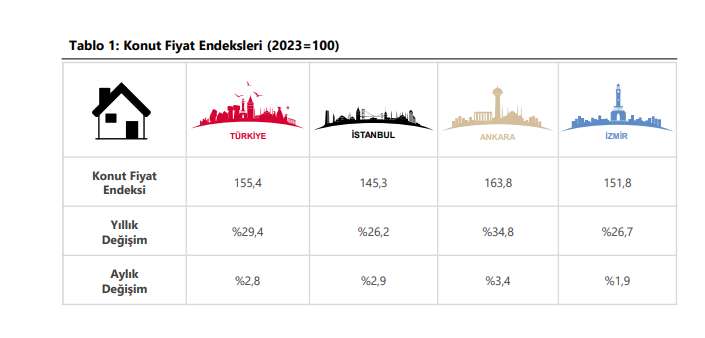 İstanbul, Ankara ve İzmir’in konut fiyat endekslerindeki gelişmeler değerlendirildiğinde, 2024 yılı Kasım ayında bir önceki aya göre, sırasıyla yüzde 2,9, 3,4 ve 1,9 oranlarında artış gözlenmiştir. Endeks değerleri bir önceki yılın aynı ayına göre, İstanbul, Ankara ve İzmir’de sırasıyla yüzde 26,2, 34,8 ve 26,7 oranlarında artış gösterdi.